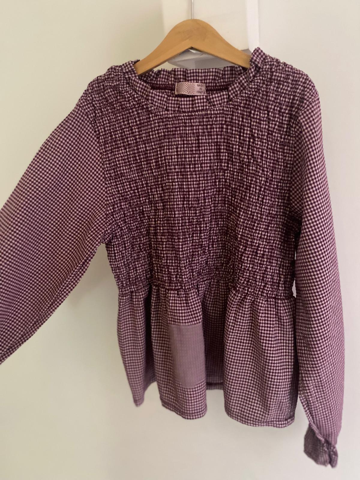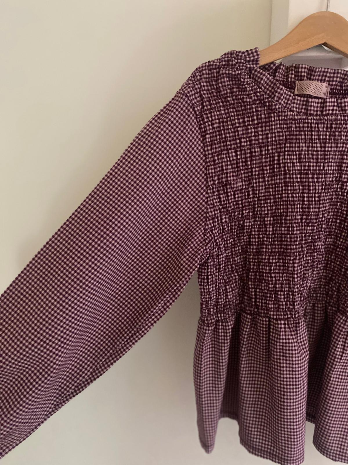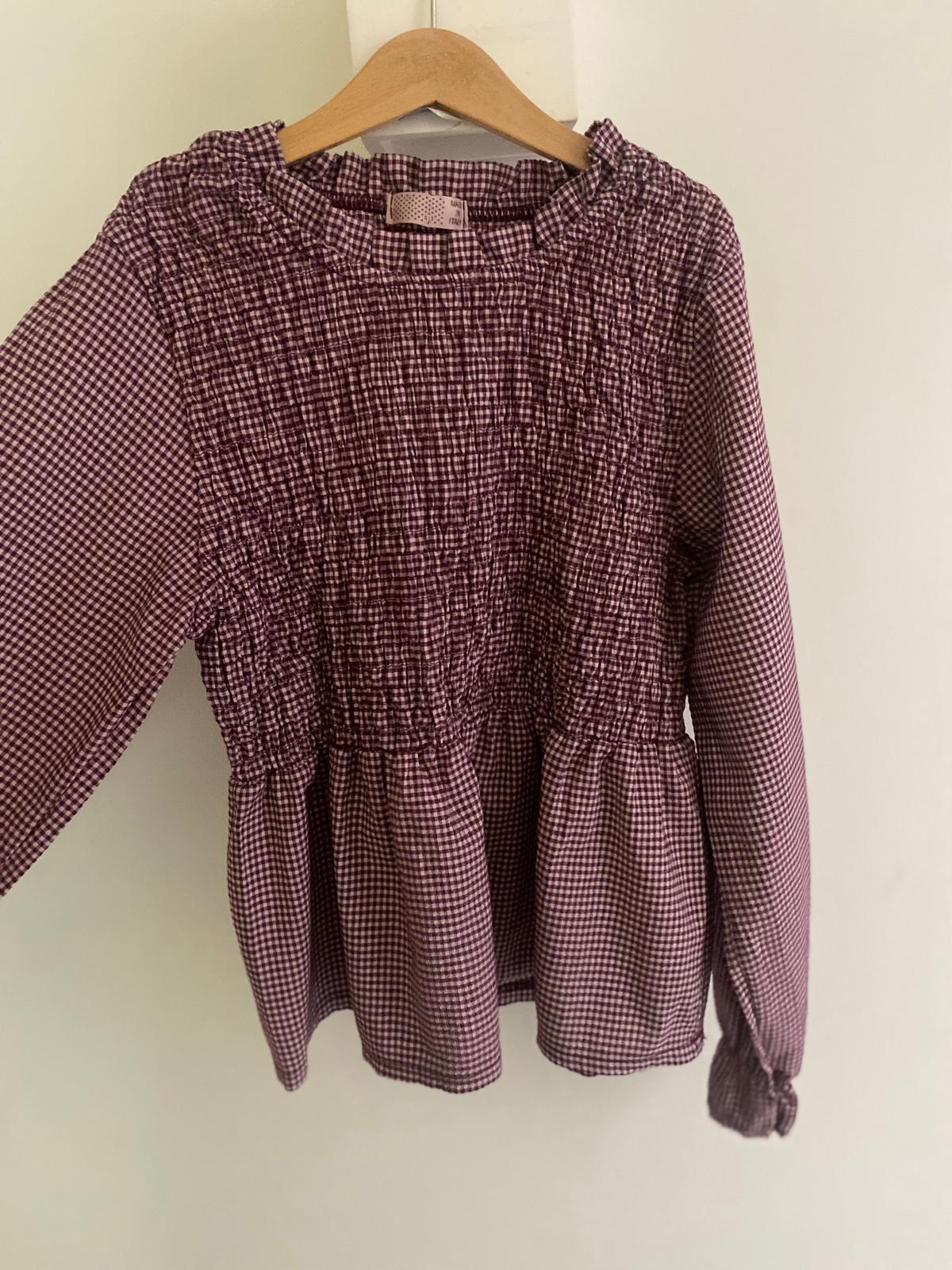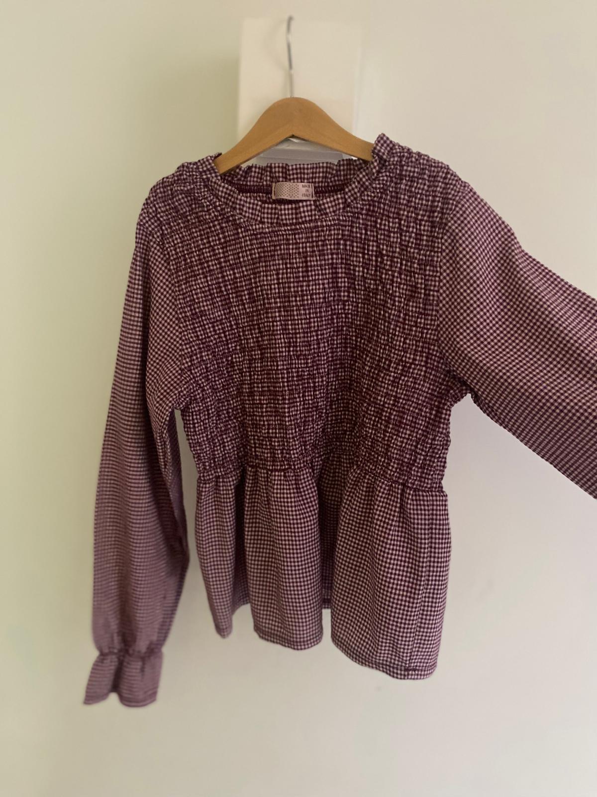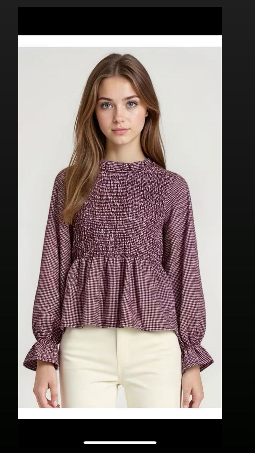 Blusa de cuello redondo con fruncido y estampado de cuadros en blanco y burdeos