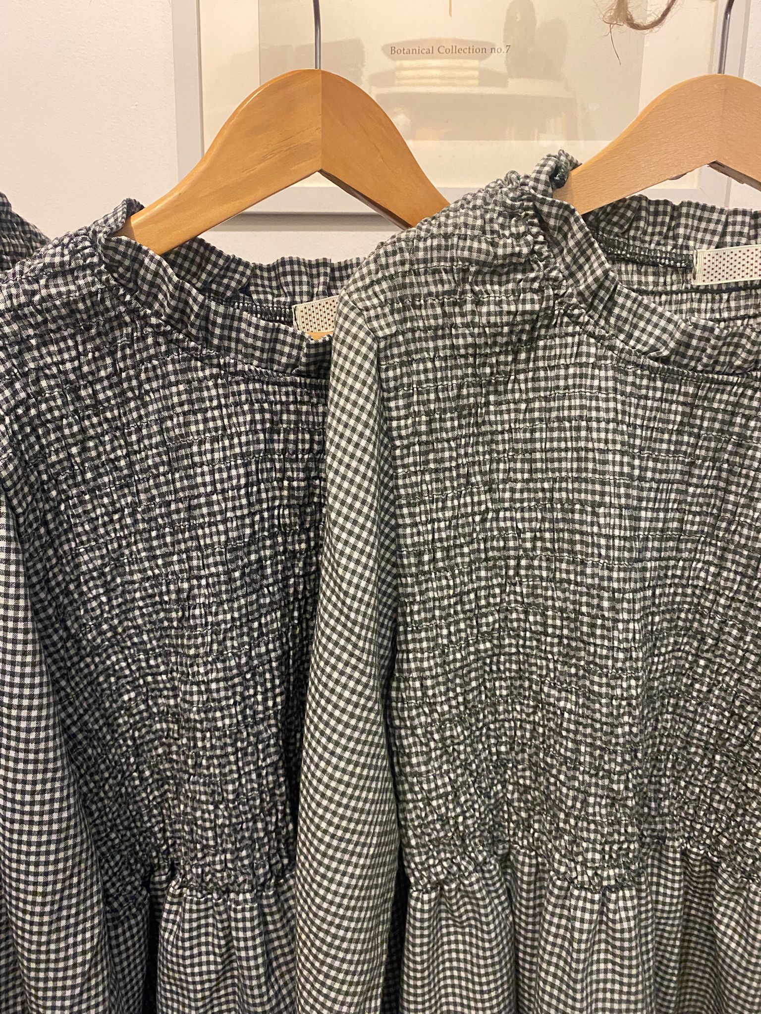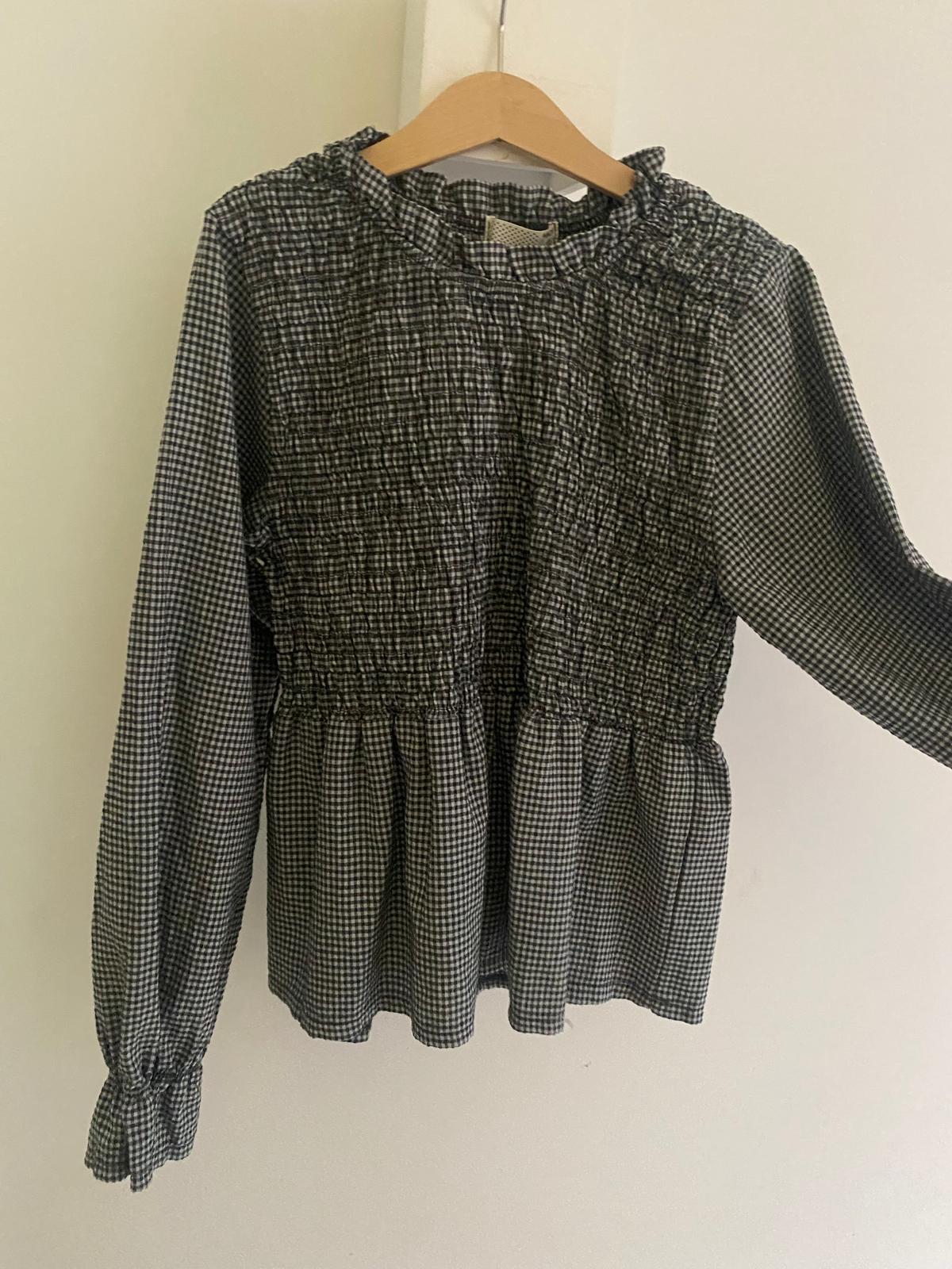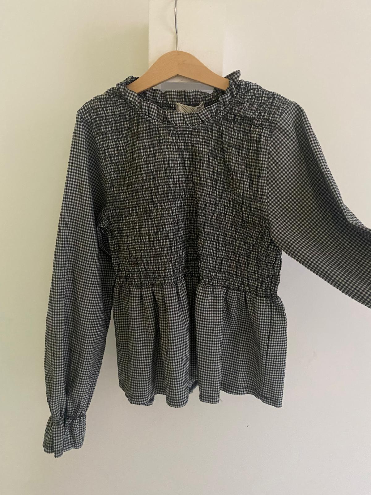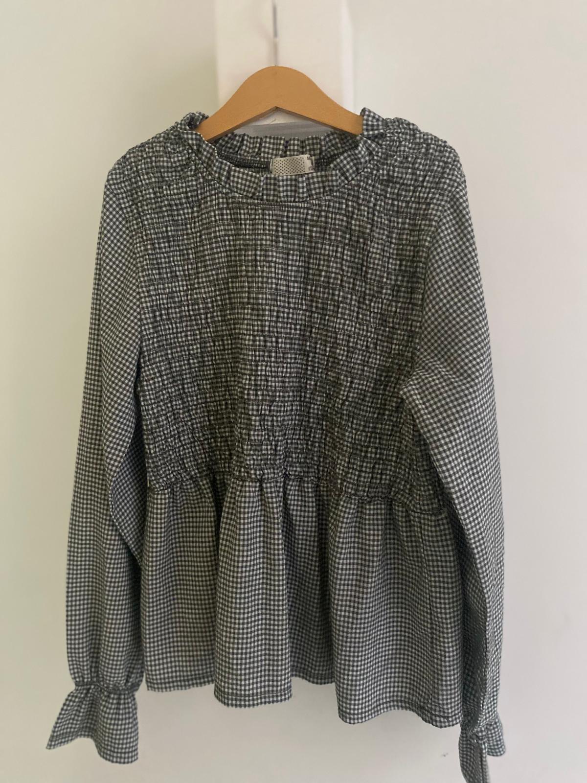 Blusa de cuello redondo con fruncido y estampado de cuadros en blanco y gris